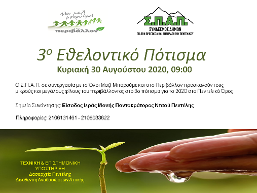 Ο Σύνδεσμος Δήμων για την Προστασία και Ανάπλαση του Πεντελικού (Σ.Π.Α.Π.) συνεχίζοντας την προσπάθεια για την όσο το δυνατόν καλύτερη αποκατάσταση του φυσικού περιβάλλοντος στο Πεντελικό όρος, διοργανώνει το 3ο Εθελοντικό Πότισμα 2020 στην περιοχή που αναδασώθηκε τον περασμένο χειμώνα, στην Νταού Πεντέλης, σε συνεργασία με το Όλοι Μαζί Μπορούμε και στο Περιβάλλον, την Κυριακή 30 Αυγούστου 2020 και ώρα 9 π.μ.