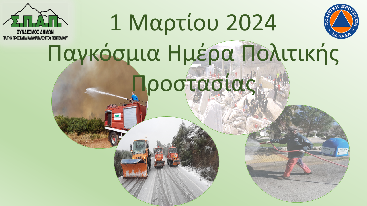 Με την ευκαιρία της Παγκόσμιας Ημέρας Πολιτικής Προστασίας 2024, ο Πρόεδρος του Συνδέσμου Δήμων για την Προστασία και Ανάπλαση του Πεντελικού (ΣΠΑΠ), Αντιπρόεδρος της Επιτροπής Πολιτικής Προστασίας και του Εποπτικού Συμβουλίου της ΚΕΔΕ Βλάσσης Σιώμος, έκανε την ακόλουθη δήλωση: