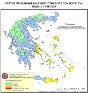 Σύμφωνα με τον δείκτη επικινδυνότητας πυρκαγιών της Γενικής Γραμματείας Πολιτικής Προστασίας, για αύριο Σάββατο 21-06-2025 προβλέπεται ΥΨΗΛΟΣ κίνδυνος πυρκαγιάς (κατηγορία κινδύνου 3) στην Ανατολική Αττική.