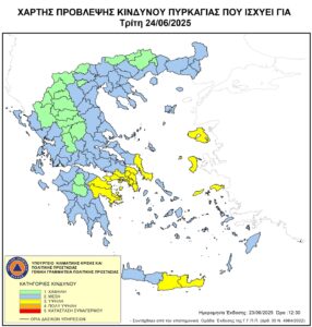 ΥΨΗΛΟΣ κίνδυνος πυρκαγιάς (κατηγορία κινδύνου 3) για αύριο Τρίτη 24-06-2025